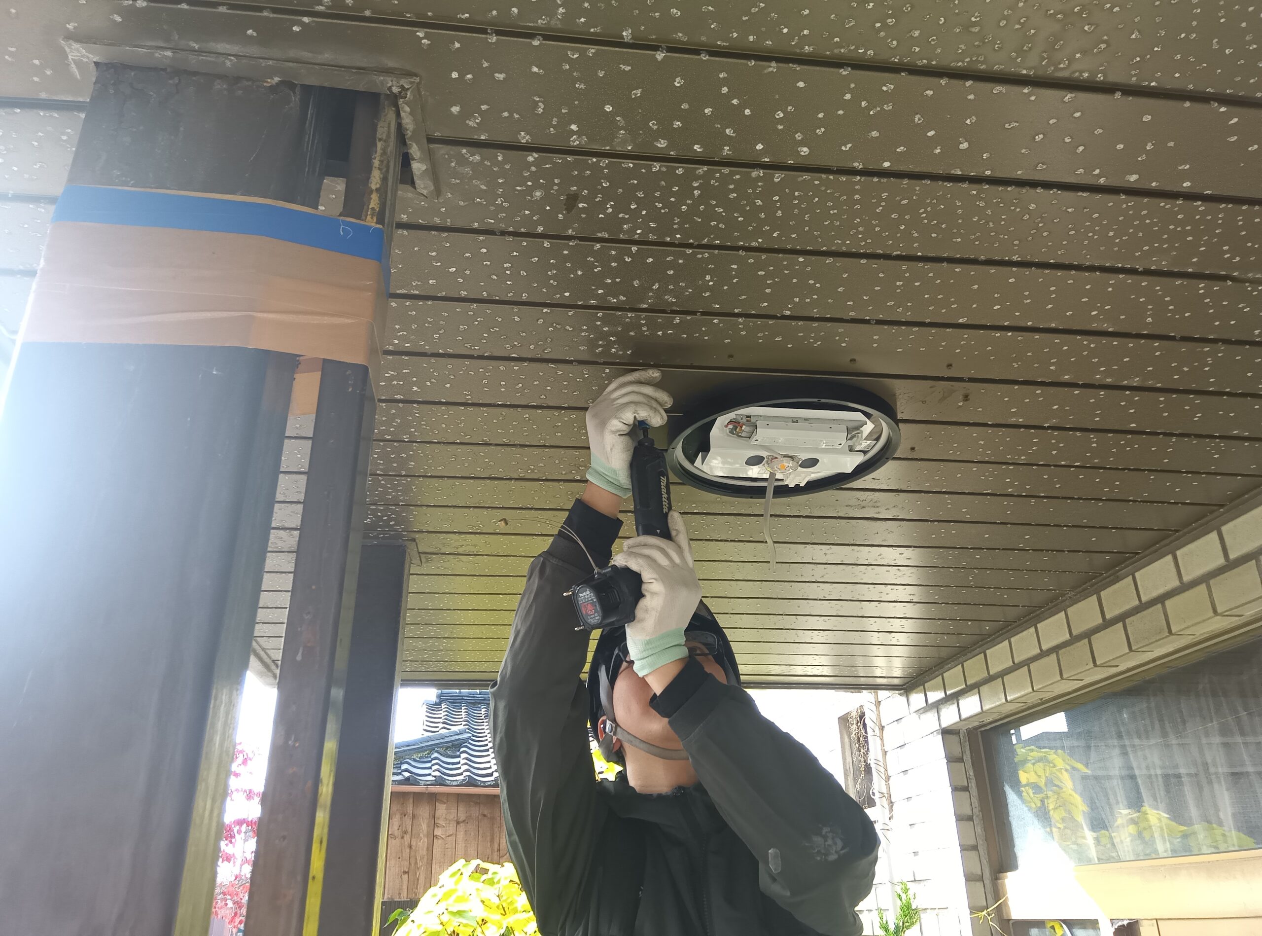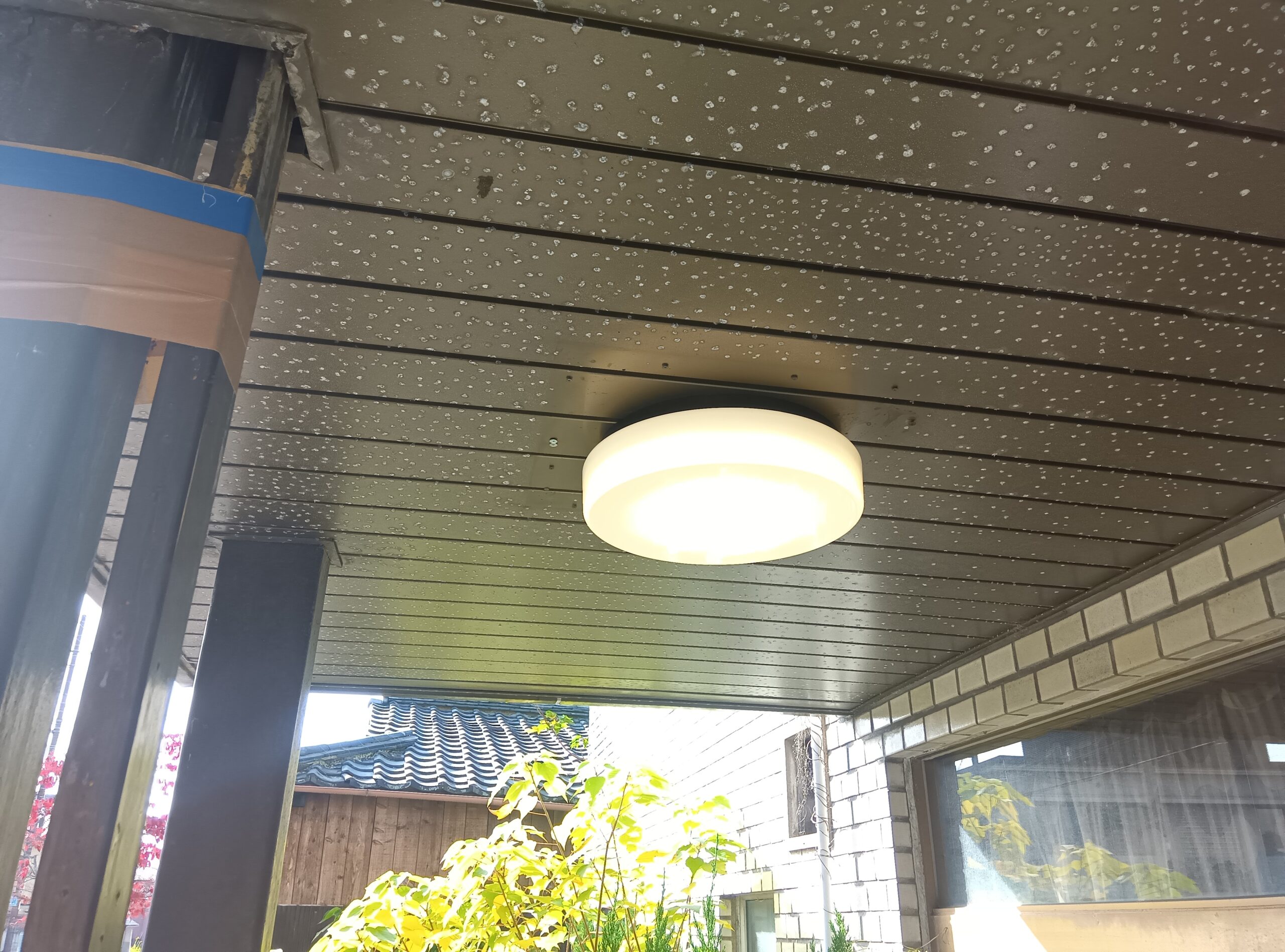 今回は、三菱電機製の防雨・防湿形小形シーリング「EL-WC1500L/K」を中心に、総数約190台の照明器具交換を実施いたしました。本製品は、眩しさを抑えた温かみのある電球色(3000K)が特徴で、入居者様に安心感を与える落ち着いた空間づくりに適しています。